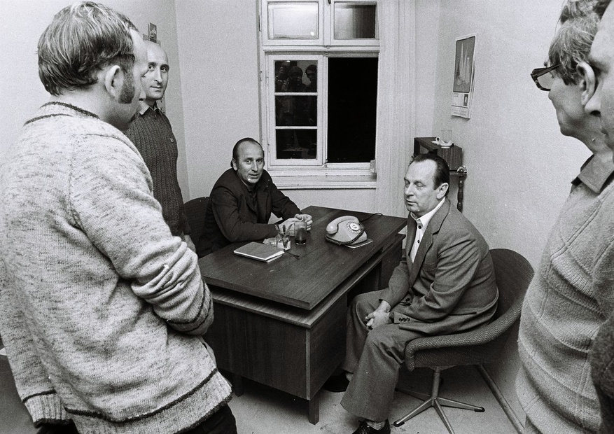 Władza rozmawia ze strajkującymi w zajezdni nr VII Rozmowy prezydium MKS z wojewodą Januszem Owczarkiem w obiektywie Wiesława Dębickiego. Zdjęcia ze zbiorów Ośrodka "Pamięć i Przyszłość". Czesław Stawicki, Zbigniew Kopystyński, Jerzy Piórkowski i Janusz Owczarek, Zbigniew Przydział ← → 2020-12-03 galerie dolnośląskie