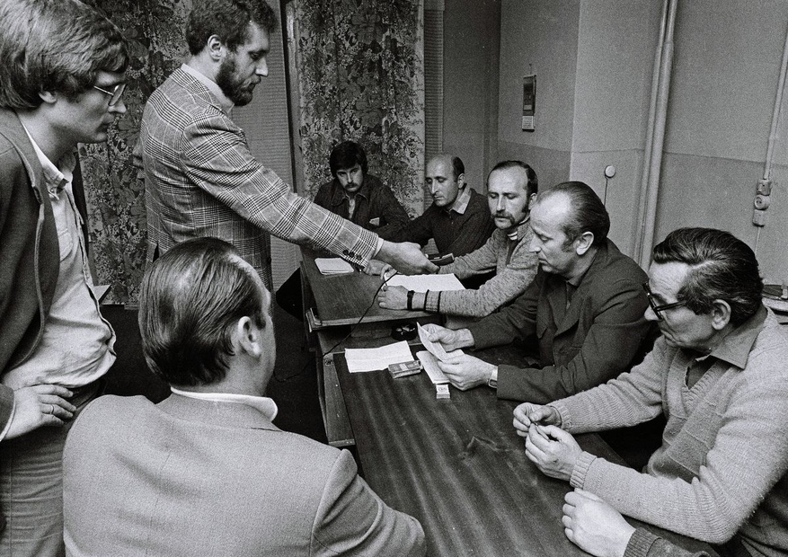 Negocjacje podczas strajku w Zajezdni przy ul. Grabiszyńskiej. Przy stole od prawej: Zbigniew Przydział, Jerzy Piórkowski (przewodniczący MKS), Czesław Stawicki, Zbigniew Kopystyński, Władysław Frasyniuk. Tyłem wojewoda Janusz Owczarek.