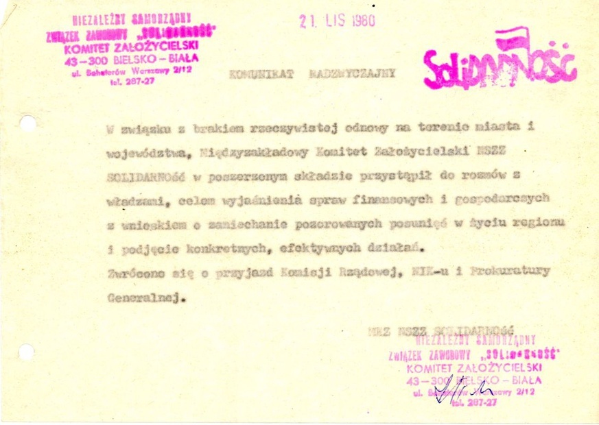Strajk na Podbeskidziu. Kalendarium Autor: Archiwum podbeskidzkiej Solidarności Komunikat nadzwyczajny podbeskidzkiej Solidarności z 21 listopada 1980 roku ← → 2021-02-02 podbeskidzie